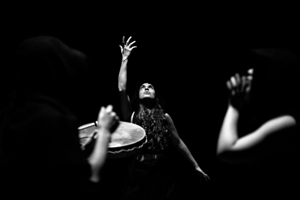 Tworząc spektakl, szukamy współczesnego rytuału, składającego się z działań ruchowych i wokalnych, odnoszących się do tekstu Szekspira. Szukamy obrzędu, który mógłby przywrócić sens pojęciom: „wspólnota”, „odpowiedzialność”, „granica”. Odprawiamy go, by zrozumieć, z jaką łatwością człowiek wchodzi w ciemność, gdy kieruje nim zachłanność, ale także by spróbować przekształcić rzeczywistość, w której przemoc wydaje się koniecznością.