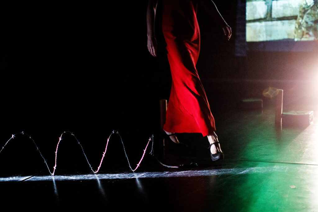 T H E B O R D E R / G R A N I C A to performans o tworzeniu nowego, intymnego języka [Nie]Obecnych, który przestaje być „drutem kolczastym”. Pisząc o „drucie kolczastym”, pragnę przywołać obraz dialogu więźnia czy więźniarki ze światem zewnętrznym albo osobę uchodźczą za owym drutem. Ciągle słyszymy głosy mówiące o tym, że pragniemy człowieczeństwa, a nie drutu kolczastego.